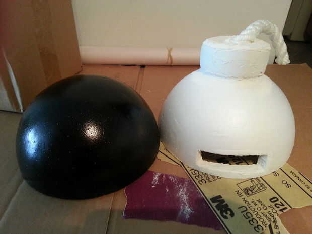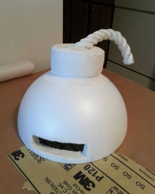 Utiliza dos apeaderos de una bola de espuma. He añadido extra espuma y yeso para formar la parte superior de la bomba. Luego agregó en un 1 pie de cuerda a la parte superior. Parte de la cuerda es yeso no vendría floja una vez el yeso secado. Corte un agujero en la pieza de arriba para que la pantalla LCD puede mostrar a través de una era todos junto.