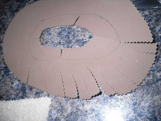 Tomar tijeras y realizar pequeños cortes desde el borde del círculo grande en el pequeño círculo... Este creats de la franja. Hacerlo todo el camino alrededor