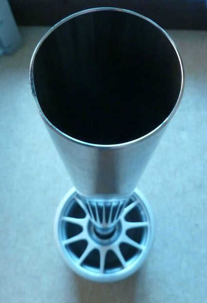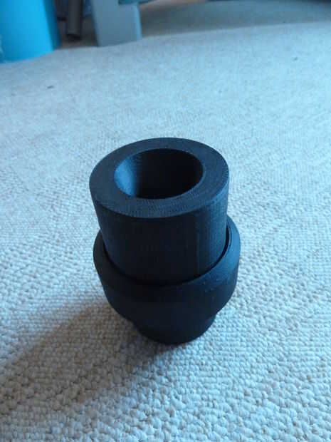 Este conjunto es un poco más difícil. Mientras que el momento de carga es menor, el centro de peso de los gases de escape aún pone un constante momento de flexión de esta articulación. Seleccioné el tubo del eje que el mismo diámetro que el tubo de escape por lo que no podemos usar el mismo truco de tener dos puntos de transferencia de carga entre los tubos concéntricos. En su lugar necesitamos hacer un conector de empalme que se desliza suficientemente lejos dentro de cada parte para tomar los momentos de flexión sin tensión excesiva. Basado el deign en el área de construcción máxima de la impresora 3D de Up me utilizando el conector va unos 50mm por dentro el tubo de escape y hacia abajo en el tubo del eje. Para repartir la carga mejor diseñé también en una ranura para los tubos de deslice para apoyar localmente los tubos donde naturalmente se tire de la inserción del conector en su interior. Utilizar un ajuste más apretado aquí también para detener la lámpara de ser torcido, por lo que cuando se prueba el ajuste no empuje todo el camino (como se puede ver en la foto). Otra complicación viene de las limitaciones de la impresión 3D bajo costo; utilizando ABS significa que si tuviera que imprimir esta parte lateralmente para deformación de la fuerza máxima, así que debe ser grueso para detener las uniones débiles entre las capas de separación. Todavía necesitamos un agujero hasta el centro de cableado aquí también.