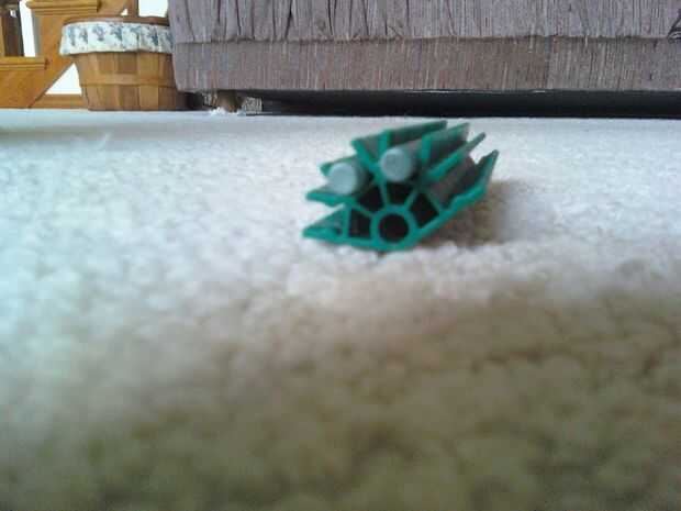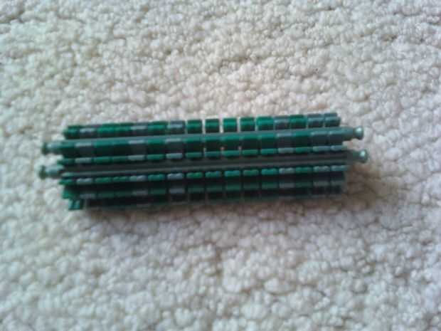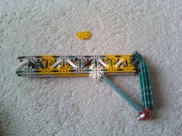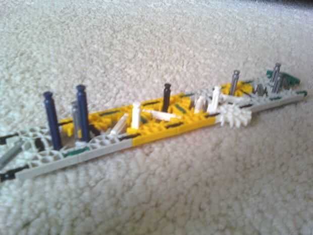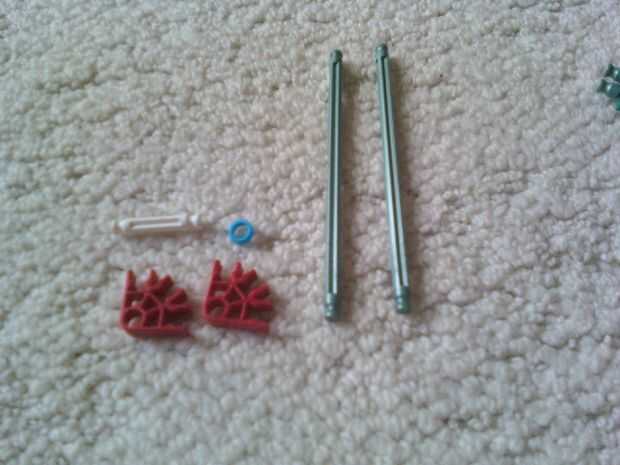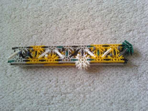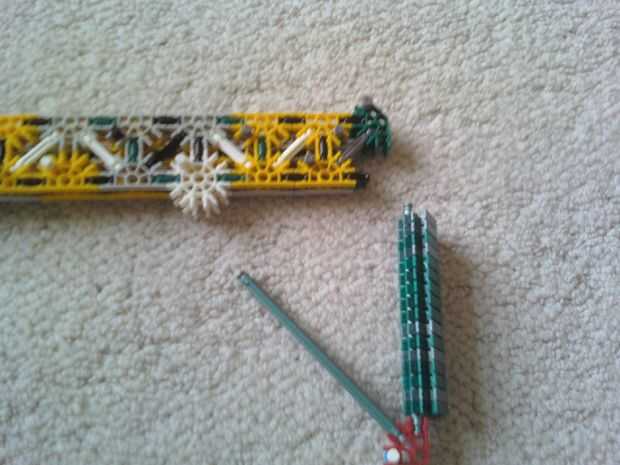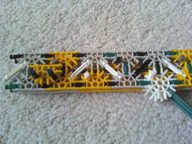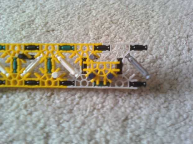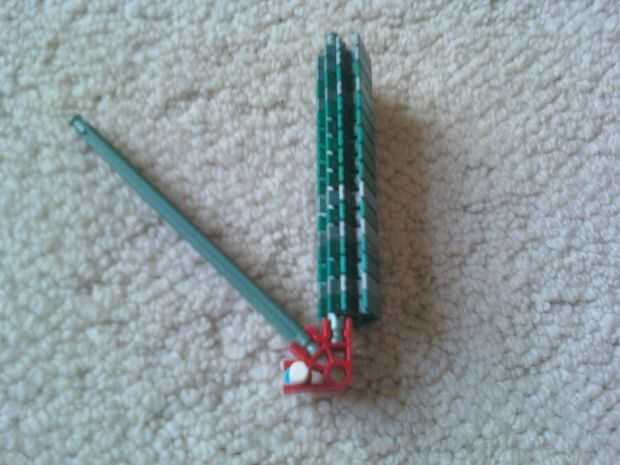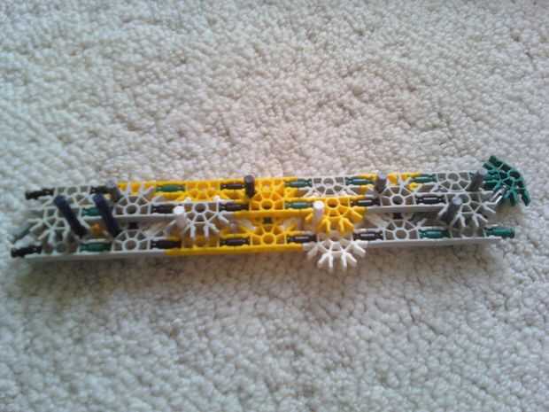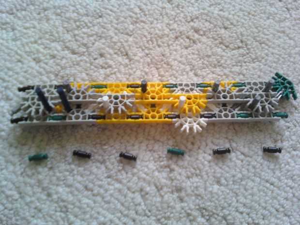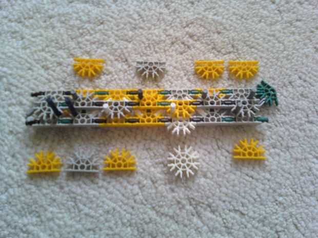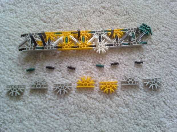 16. se reúnen 23 barras verdes, 5 conectores amarillo, 7 barras blancas y un conector verde. (lo siento el conector verde no está en la foto.)