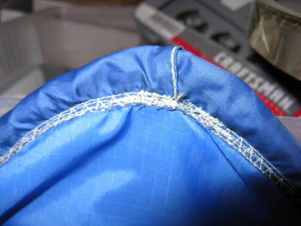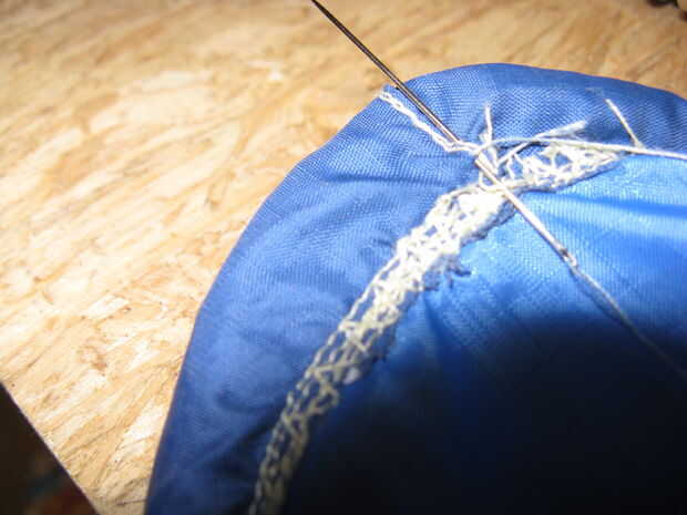 Alrededor del borde del sello trabajando la aguja a través de las dos capas de ripstop; todos aunque teniendo cuidado de no coser a través de él (ya que esto causará desequilibrios en vuelo). Nota: ahora es tu última oportunidad para agregar cualquier arena.