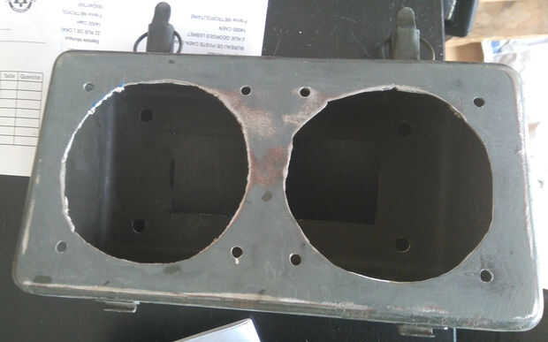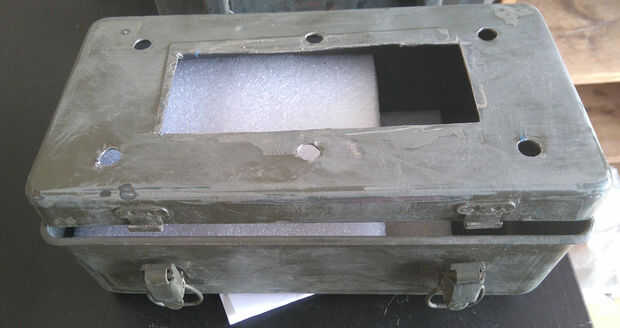 Para cortar la caja hice un diagrama de muster con un taladro, jigsaw y amoladora corte los orificios para los altavoces. Fue un paso muy difícil y los círculos no son perfectos pero los altavoces queden bien. Entonces, he hice una abertura en la parte inferior de la primera casilla y en la parte superior de la segunda para que el aire pase a través de las dos cajas. He sellado las dos cajas junto con silicona y añadió 6 pernos para reforzar la estructura. Después de realizar el corte y perforación, I lijar y pinta el cuadro antes de insertar los componentes. Usé pintura de efecto martillado, que creo que da volumen al metal.
