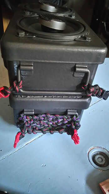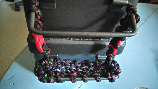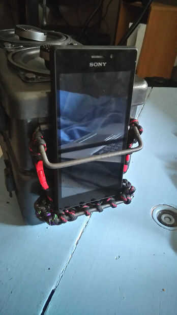 Mango metálico dos ya están en las cajas. Simplemente les vinculados con paracord para hacer un soporte para teléfono.