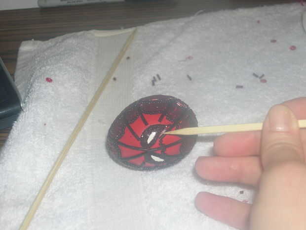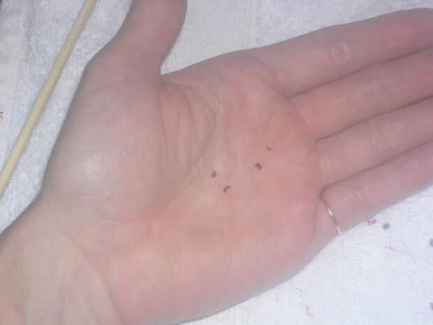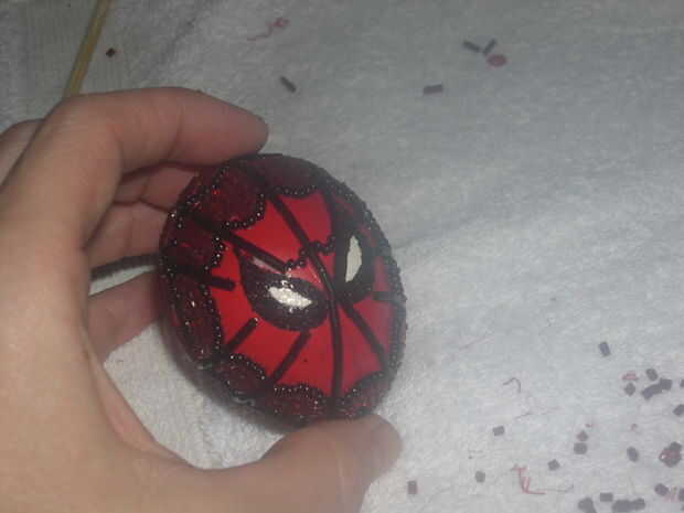 Utilice tijeras pequeñas para cortar granos rojos por la mitad, longitudinalmente. Luego coloque las mitades o piezas en el huevo cuando es necesario.