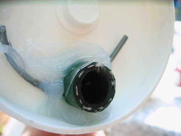 Un asimiento a través del extremo de la manguera del taladro, empuje la manguera en la tapa, luego bloquearla con el alambre.