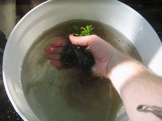 Con un cubo de agua, sumergir las raíces de la planta y lavar suavemente la suciedad.