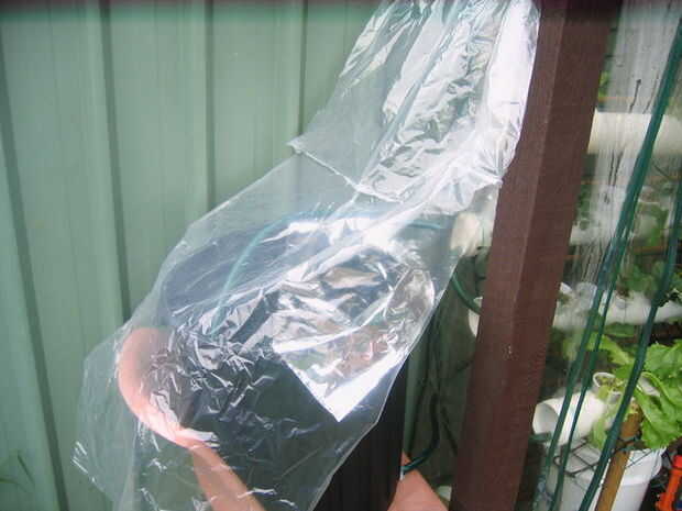 Una solución simple fue conseguir una bolsa de basura transparente, corte abierto y colocar el invernadero, sobre las patatas.