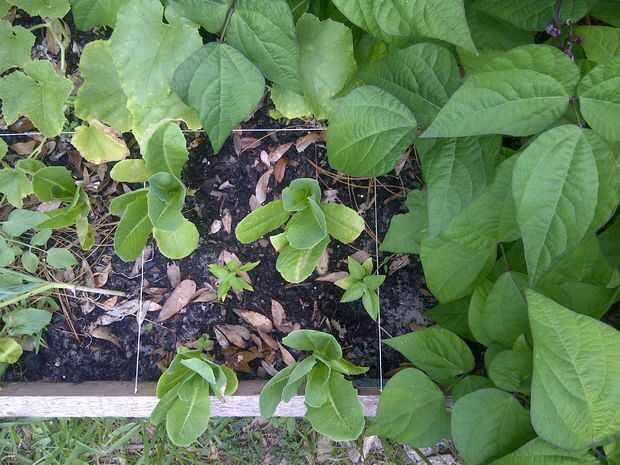 Mano de obra: La hierba fue eliminada primero y cavó abajo otro pie para permitir que las raíces profundas. Luego añade la mezcla de compost a la altura de la cama levantada y mezclan el suelo otra vez. Esta técnica es a veces conocido como "doble cavado" o francés intensivo estilo. El diseño se mide en unidades de 1 pie en una cuadrícula. Que encadenan la guita para hacer los cuadrados y había grapada a la madera. La distancia entre plantas es muy denso. Esta técnica desalienta el crecimiento de malezas y plagas, ayuda a retener la humedad y produce un alto rendimiento en un espacio pequeño.