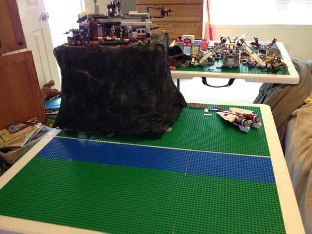 Así que para este Instructable quería construir un completo escenario de Lego que consiste en la reparación de la base de ser atacado por el ejército de clones. Comenzamos con su mesa de Lego (un proyecto construido con un placas de Lego plegable de mesa y 12 X 12", que serán parte de otro Instructable). Él colocó la montaña a un lado y comenzó a construir la escena. Entró artillados, vehículos de AT-ST fueron utilizados. Anakin Skywalker y otro jedi estaban incluso en caballos. Los clones escalan la montaña y los droides de combate detrás.