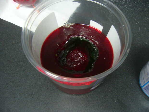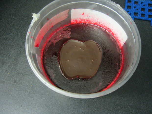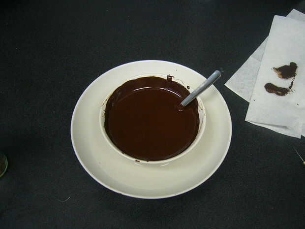 Yo estoy vertiendo chocolate ya que parece ser el único material de fundición fusión no puedo encontrar en Instructables HQ. Además, chocolate es sabroso :) Demasiado caliente es peligroso dado el bajo punto de fusión de la gelatina - así que ten en cuenta y experimentar primero ;) Se me permite mi chocolate se enfríe mucho antes de verter - probablemente overkill, pero mejor seguro que residuos por valor de medio día de trabajo.