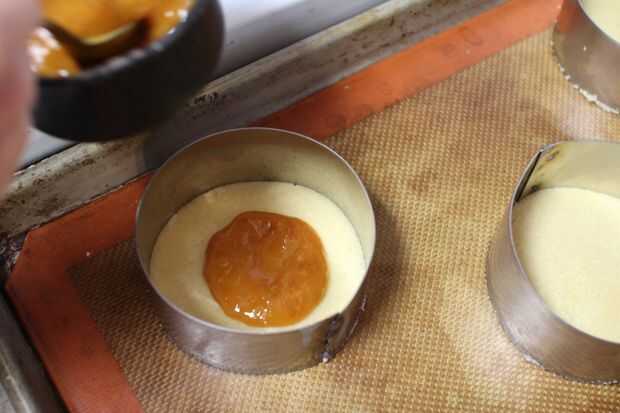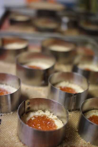 Con esta receta que hicimos la masa, cortar con los aros, añadir un poco de mermelada de albaricoque casera, utilice un pedazo de papel de aluminio como un cono para esparcir el streusel alrededor de los bordes, mezcle en el horno.