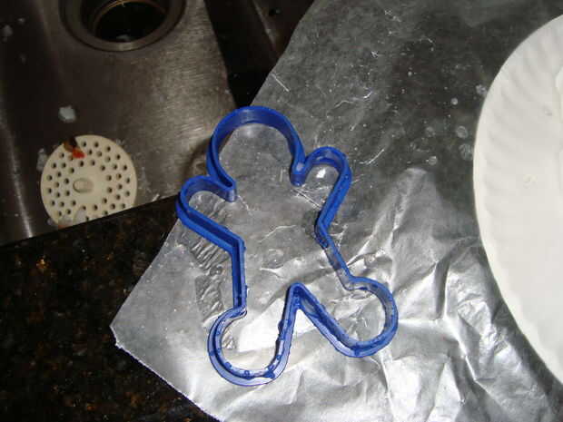 Lo que hice fue que poner un cortador de galletas en algún papel encerado vierte entonces la mezcla de bioplástico antes que cocidas. Cuando me di cuenta que estaba goteando un poco acaba de poner alguna cinta alrededor de ella y estaba bien.