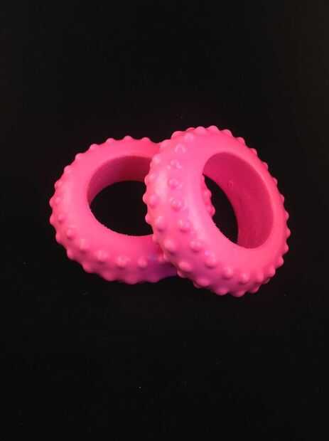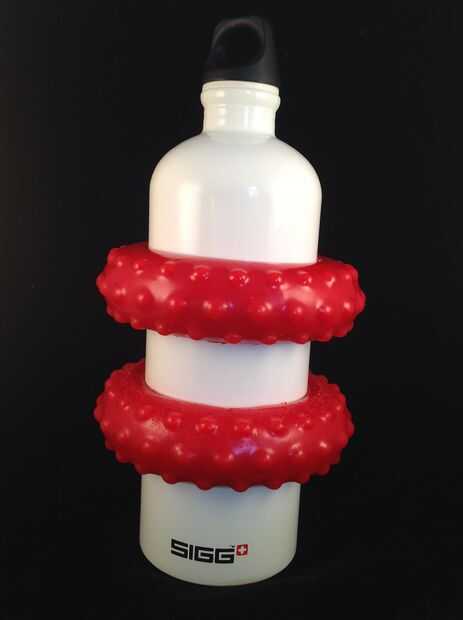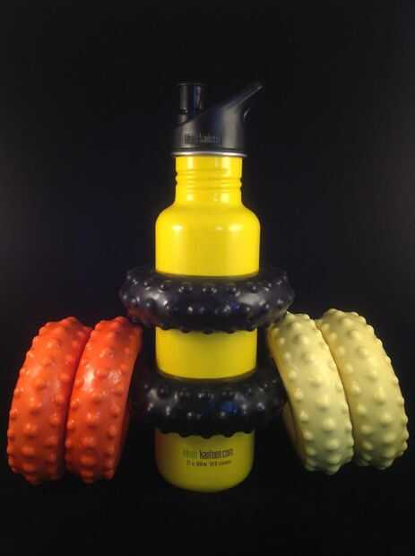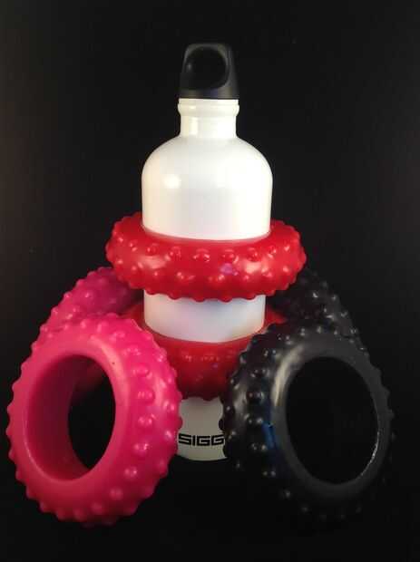 The MuscleTreads™ botella de agua masajeadores son anillos de goma del poliuretano de Lisa On Vytaflex® 60. Se diseñan para caber en una botella de 1 litro SIGG (o cualquier botella ~ 3,2" de diámetro) para convertir su botella de agua en un masaje de espalda (utilizado en el piso o contra una pared o una silla).