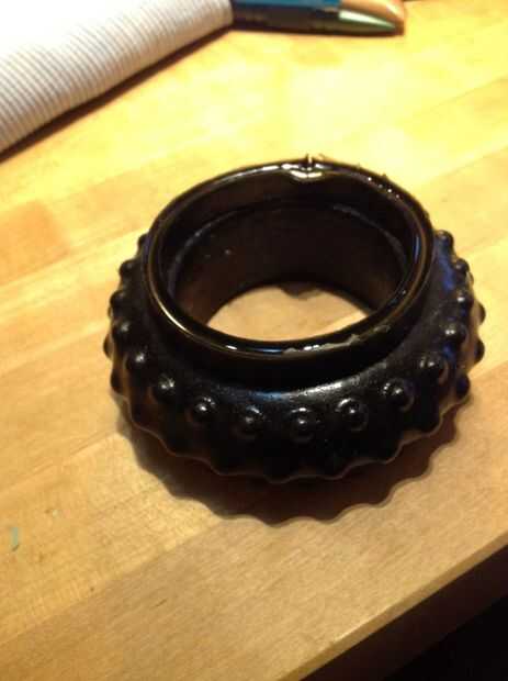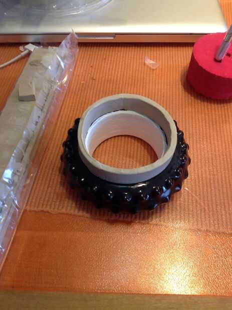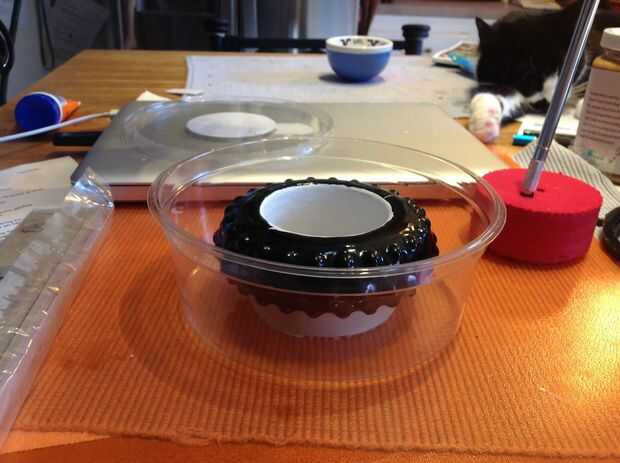 Mi primer intento fue con el impreso modelo 3D del ABS que se utilizó para el molde de dos partes... cuando derramé el material del molde (MoldStar 16--una silicona de fraguado rápido), el modelo rápidamente se flotan a la parte superior del material. Yo acabé girando el modelo boca abajo (era inicialmente de colada-hacia abajo) de forma que el lado del bebedero se levantó y llevó a cabo el modelo sumergido hasta que la viscosidad del material de molde era suficiente para guardarlo de la flotación hasta la parte superior. Este molde (no mostrado) trabajó bastante bien, excepto por una trampa de otros--había utilizado una caja de moldeo que era demasiado suave, un envase de palomitas de maíz, por lo que el fondo bombeado durante el ajuste del molde. Cuando puse este molde para verter, el diámetro interno terminó empujando hacia fuera y es mayor que el resto del elenco.