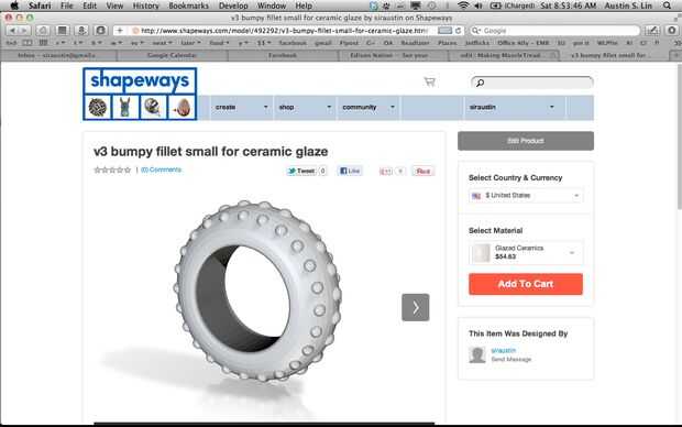 También pueden tener impresión en cerámica y esmaltado en Shapeways. Cuando subes el archivo STL, elegir "milímetros" como las unidades porque es la manera de que las exportaciones de Autodesk 123D. Tenga en cuenta que el esmalte de cerámica agrega algunos grueso, así que basado en mi experiencia pasada con la impresión de algo esta forma, haría que el interno * diámetro * sobre 4mm/0,15 "más grande que desea que el diámetro interior final. No hay garantías aquí--se basa en un punto, imprimí 3" de diámetro y regresó con un diámetro 2,85". Shapways ha las instrucciones de diseño para la impresión cerámica.