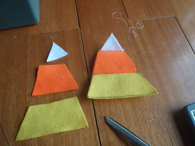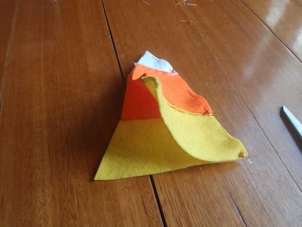 Cose las piezas juntas. Cada pieza de un tamaño más grande que la anterior se. Por ejemplo cuando se cose la pieza blanca y naranja juntos, frente a ellos hacia el interior y coser a lo largo de la línea de ensamblaje, como en la imagen. Una vez que tienes dos triángulos, cada uno con tres colores, enfrentan a los dos triángulos juntos y coser a lo largo de los dos lados largos. Ahora vuelta adentro hacia fuera y rellenarlo con la fibra de relleno. Seguramente todavía no bastante como lo hice, pero ahora coser la parte inferior. Ahora para la cara! Dibujar en cualquier cara que te gusta! Hice un estilo anime, el diseño de ojos cerrados. Incluso podría hacer una cara para cada lado.