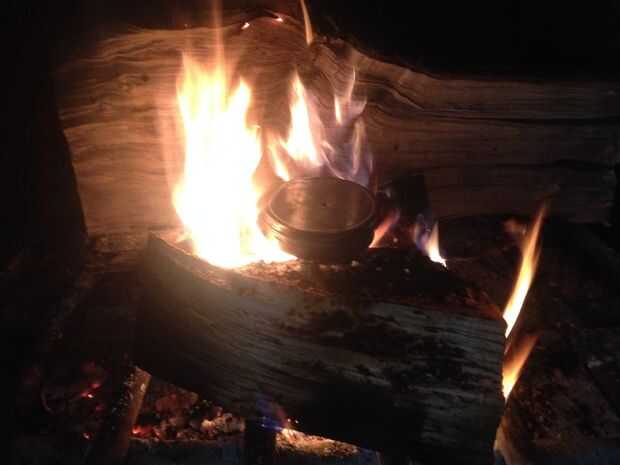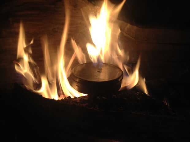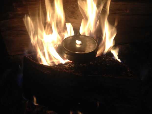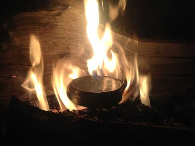 Coloque la lata en el fuego y esperar. Dependiendo de cuán caliente es el fuego en aproximadamente 30-60 segundos comenzará a fumar y una llama se dispara hacia fuera el agujero.