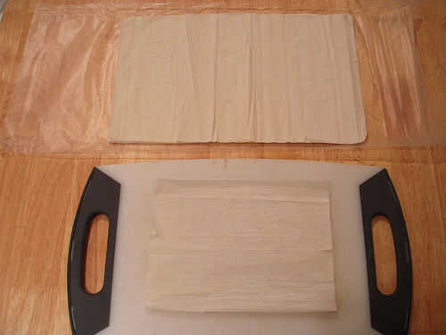 1) Abra el paquete de pasta filo. (cada capa de masa es cerca de 9 "x 12") 2) pick 3 capas de pasta filo y doblarlas una vez para que sea hasta la mitad. (Doblan, porque son demasiado delgadas. Grueso hace que nuestro trabajo sea más fácil) 3) debe tener algo como esto.
