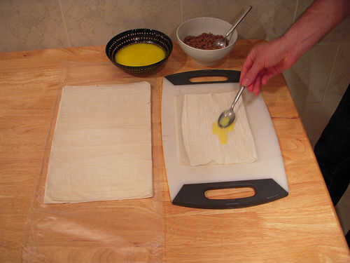 Aplicación, mezcla de huevo yema de huevo - aceite de oliva - agua igualmente en la superficie de la masa, como en la imagen (2 o 3 cuchara de la mezcla será suficiente para cada Borek.