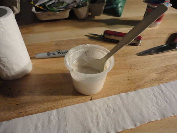 Mezclar agua y harina para hacer una pasta. Extienda una tira de goma a lo largo de la longitud en una línea para aceptar la semilla.