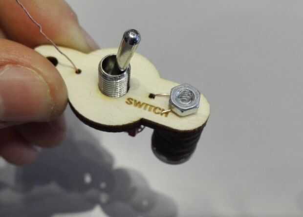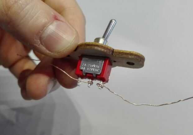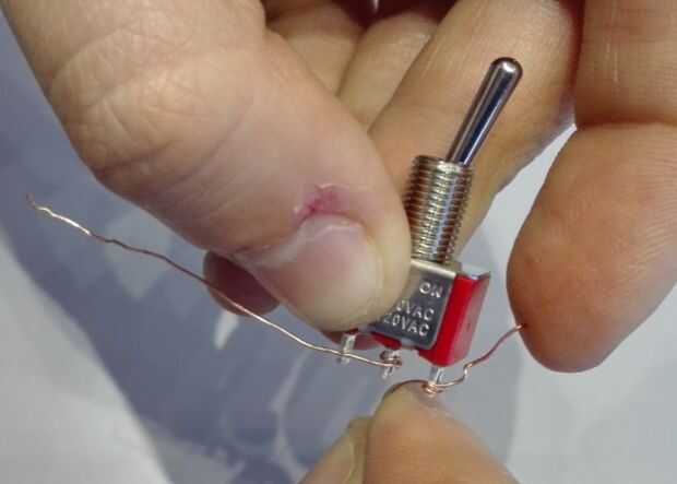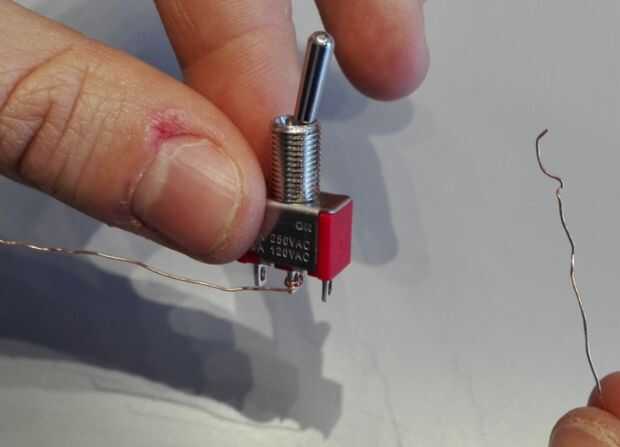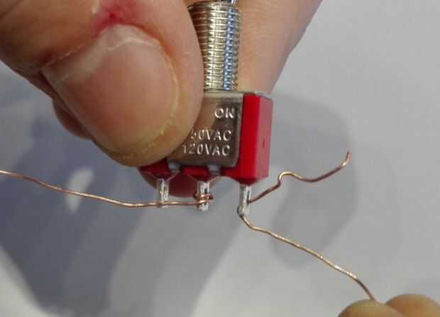 Una vez hayas terminado, echa un vistazo a su conmutador. Como se puede ver, tiene tres clavijas diferentes. Sólo vas a usar dos de ellos. Tomar dos trozos de alambre de cobre y sujete a dos pernos, como se muestra en las fotos. Tenga en cuenta que no debe ser cualquier conexión entre los pines, así que asegúrese de que los cables no toquen.