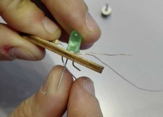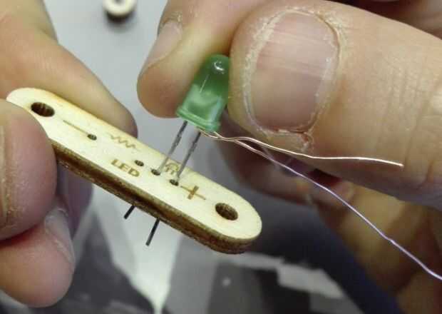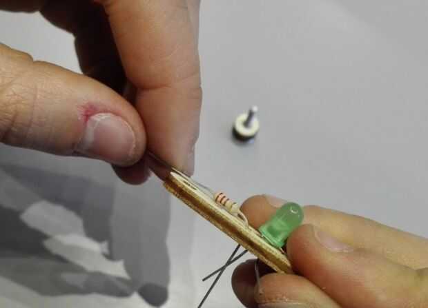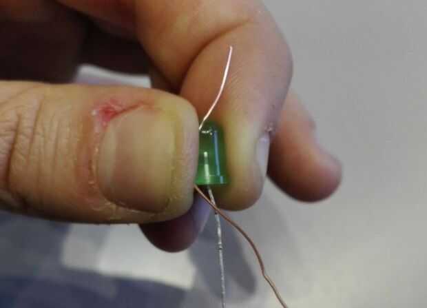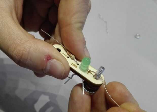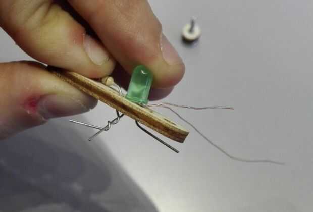 Ahora vamos a construir el LED. El LED está polarizado. El perno más largo es el positivo y por lo tanto debe colocarse del lado de la base que está marcada con "+". Crear la conexión entre el perno y el tornillo con alambre de cobre.