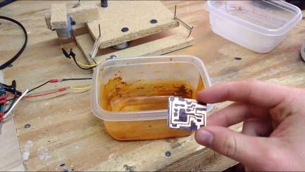 Este instructable es parte dos en mi tablero del circuito serie de fabricación. Esta parte se puede utilizar como soporte solamente instructable sobre grabado de placas de circuito. Después de las huellas en el tablero se dibujan con un rotulador permanente, todo el cobre alrededor de los rastros puede eliminarse mediante un proceso llamado aguafuerte de cloruro férrico. Este instructable le mostrará cómo tomar un trozo marcado de tablero revestido de cobre y quitar el cobre alrededor de los rastros. También daré consejos sobre cómo hacerlo de la manera más eficiente. El video de abajo se complementan este instructable.