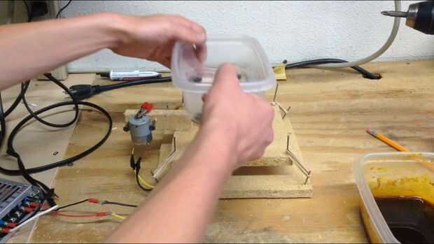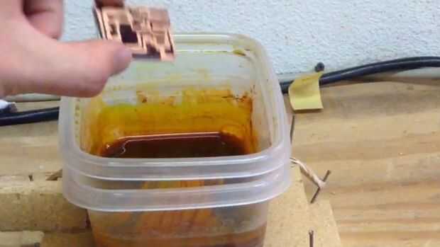 Para grabar la tarjeta de circuitos, solo agregue el tablero del circuito hacia el cloruro férrico, cobre arriba, sello para el contenedor y enciende el agitador. Es mejor consultar a la junta cada diez minutos para comprobar el progreso del grabado. En estos intervalos de diez minutos, también es bueno volver a calentar el baño de agua caliente para calentarse el cloruro férrico. El proceso de grabado puede tardar entre 15 minutos a 2 horas dependiendo de la cantidad de veces que el cloruro férrico se ha utilizado, el calor del agua, y si está siendo agitado.