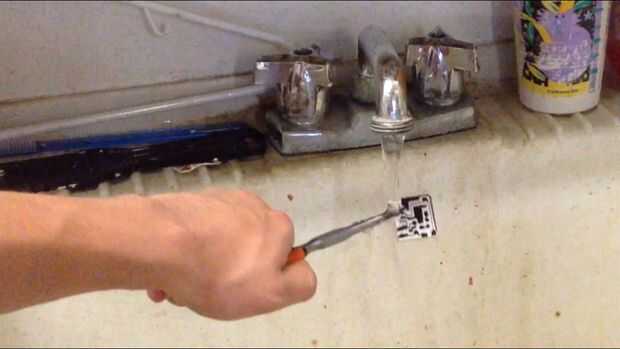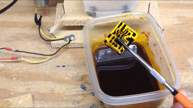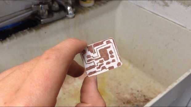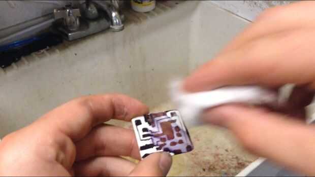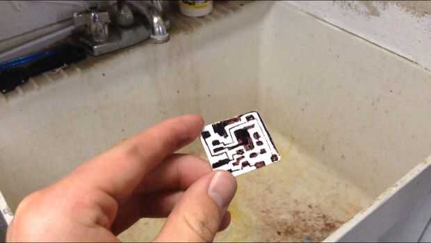 Después de que la Junta está grabada, retire la Junta del cloruro férrico con unos alicates (cloruro férrico es corrosivo!). Luego, aclararla apagado en el fregadero. Por último, lave el marcador permanente utilizando acetona en una bola de algodón. Debe tener un tablero con rastros de cobre limpio en él. En la parte 3, usted aprenderá cómo soldar las piezas en el tablero mediante la técnica de montaje en superficie.