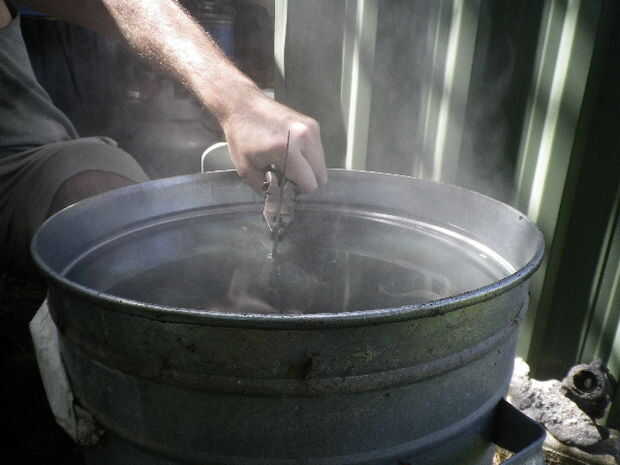 Cuando usted tiene los colores en la hoja que desee, saciar la hoja en aceite se congele los colores donde se encuentran. Si deja la hoja al aire fresco el disco todo va a ir púrpura, y usted tendrá que comenzar el endurecimiento y el Temple proceso otra vez.