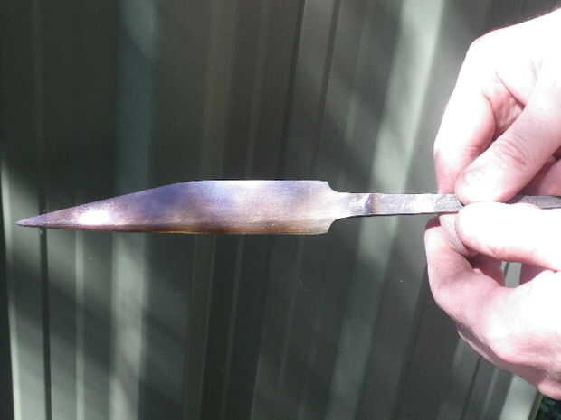 Tienes que tener cuidado en este punto, son con el objetivo de obtener un color pajizo, o un color bronce en el borde de la hoja, si pasa los colores que tienes que empezar a endurecer y templar el proceso otra vez.