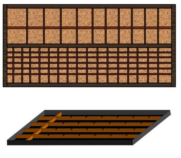 El compartimiento trasero del cajón se dividiría en 22 compartimentos con 10 tiras verticales y 1 tira horizontal (como se muestra en la figura).