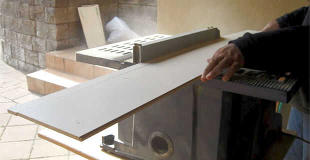 Corté tiras ancho 1 pulgada de suelo de Pergo freecycled blanco con mi sierra de mesa. Para cortar las ranuras en estas tiras que tenía que tomar una pausa y construir un trineo de corte transversal de la Sierra de mesa (sepárese instructable).