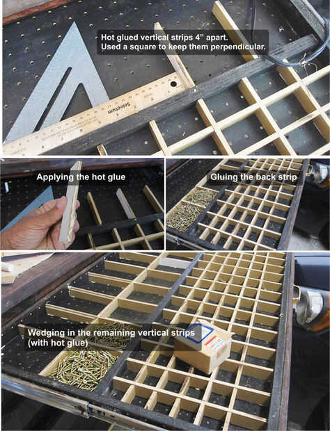 Limpiar la parte de atrás de la mitad de la parte inferior del cajón y luego directamente calientes pegadas pequeñas tiras verticales en la parte inferior del cajón unos 4' aparte. Utiliza un cuadrado para mantenerlos perpendicular al divisor del cajón grande.