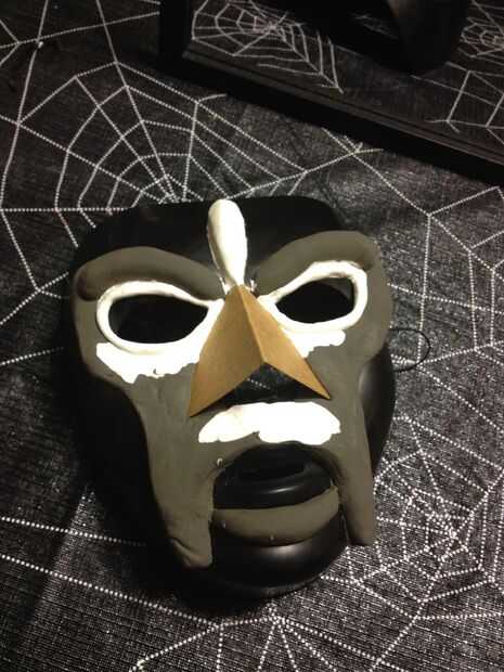 Pinté la máscara con pintura spray negra apenas para darle una capa de base. Originalmente grabó una sección en cada mejilla que planeado en dejarlos negros, pero después de la pintura plata, decidí que no me gustó cómo se veía así que pinté la plata de las mejillas demasiado.