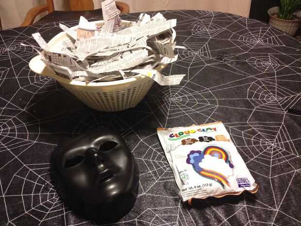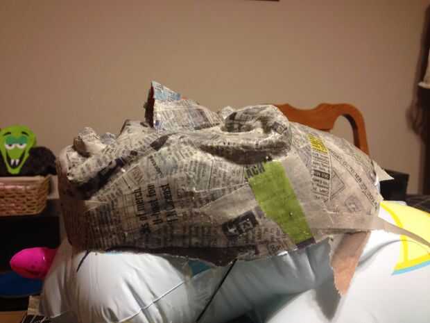toda máscara. Utilicé un pincel pequeño para distribuir la mezcla de pegamento para que satura las tiras de periódico asegurándose que todo poner liso y confirmó a las varias curvas en la máscara. Para más curvas o curvas compuestas, puede rasgar algunos relieves en las tiras de periódico para que puedan ajustarse a la forma apropiada.