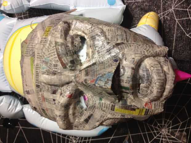 Hice dos capas de periódico y luego ponerlo delante de un ventilador para dejarla secar. Cuando se utiliza la pasta de harina-agua, es un riesgo que si se queda húmedo demasiado tiempo, molde podría desarrollarse y crecer, por lo que es una buena idea para dejar que se seque completamente después de cada pocas capas.