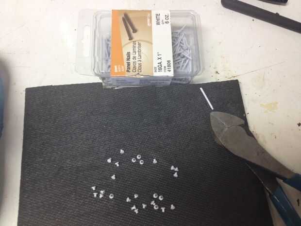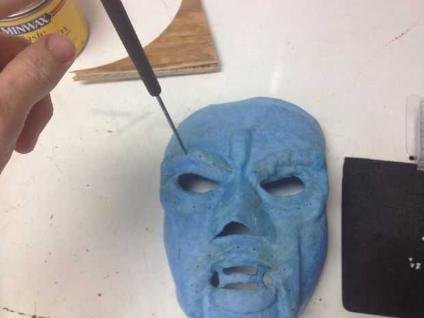 Para dar la máscara de una clavada, utilicé las cabezas cortadas de clavos de paneles de calibre 16. Usé un pick para empujar los agujeros en los lugares apropiados en la máscara y pegado en las cabezas de los clavos.
