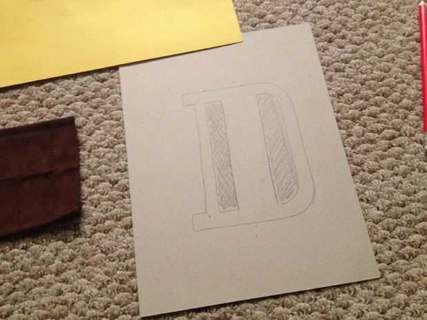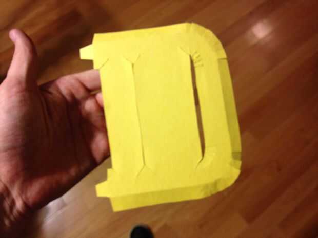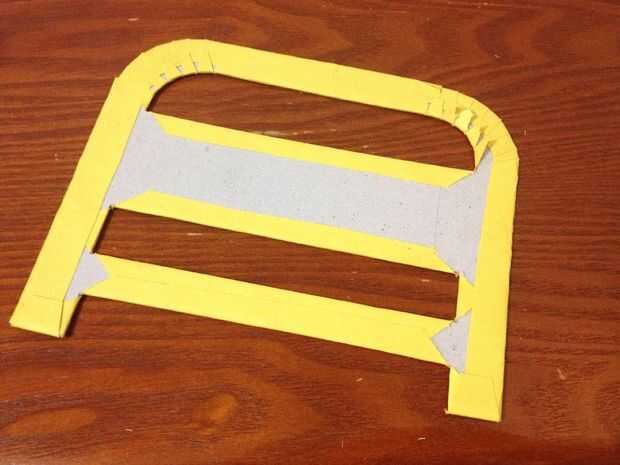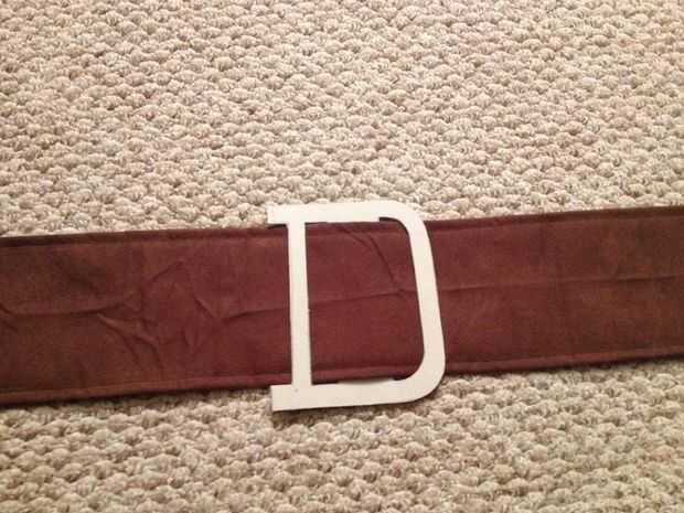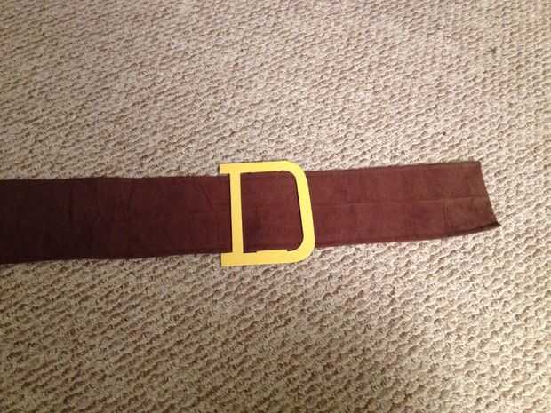 Para la hebilla, que poner la correa bonitos en una pieza de fino cartón (cartulina gruesa??) y marcado el espesor de la correa. Entonces dibujé una "d", dejando una sección de la correa de lazo sobre. Usé pegamento de spray para pegar papel de construcción amarillo para el rostro de la hebilla. Relieves alrededor de las curvas de corte inglete las esquinas y envolver el papel amarillo en la parte posterior. Reducir los bordes con pegamento o cinta.