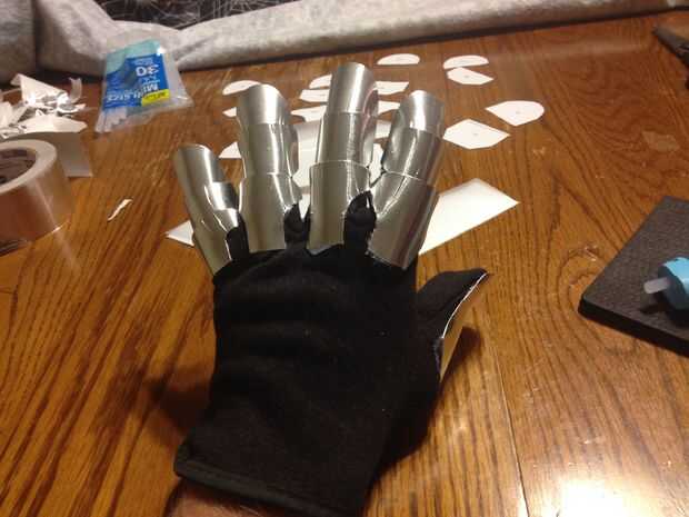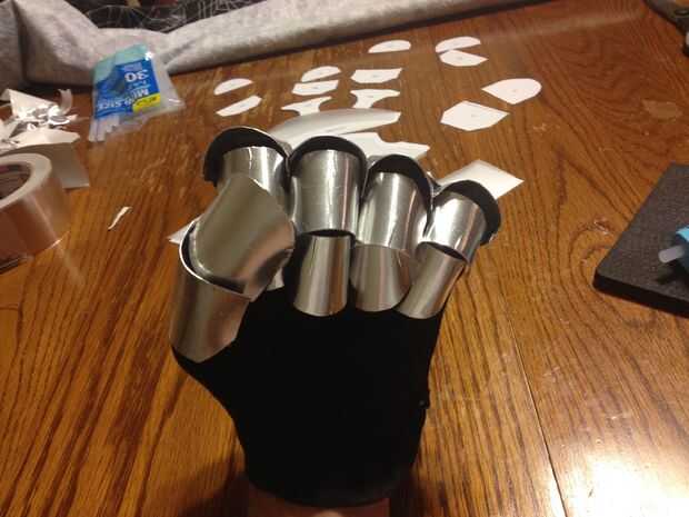 Si tuviera que hacer otro par, lo haría cada placa dedo por ensayo y error. Las plantillas eran grandes, pero normalmente llevo un guante XXL por lo que hubo algunas piezas que eran simplemente demasiado corta. Por desgracia, ya tenía todas las piezas de cortan antes de que me di cuenta de que iba a ser un problema.