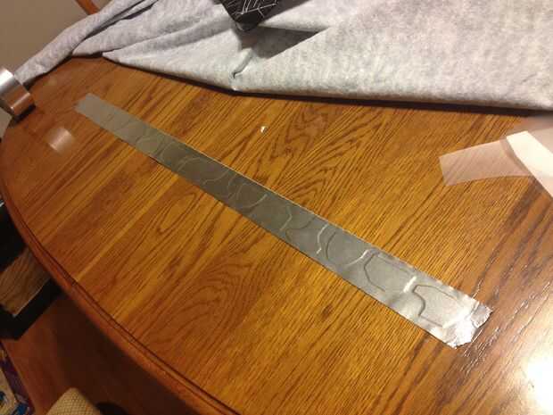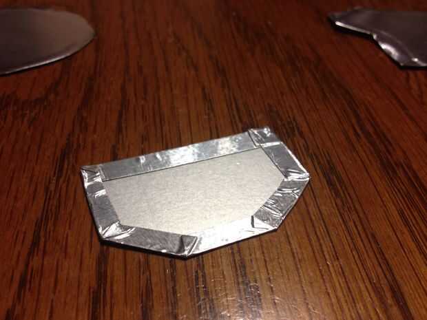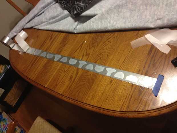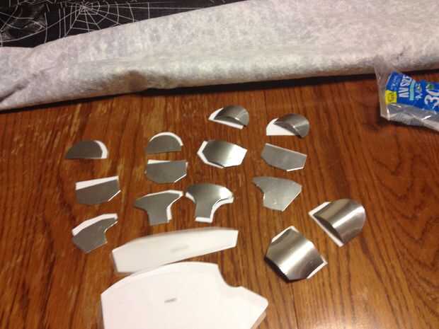 Para cubrir las muchas piezas con cinta de papel, en el segundo guante, me pareció más rápido para poner una tira larga de papel cinta adhesiva hacia arriba y coloque cada armadura de plástico pieza boca abajo sobre la cinta. Es una buena idea que marcar cada pedazo antes de mano. Vuelva a colocar el papel del forro en la cinta. Utiliza tijeras para cortar las piezas hacia fuera dejando lo suficiente para envolver los bordes. Si las piezas de la curva cuando la envoltura de los bordes la cinta les mantendrá en un estado algo curvado.