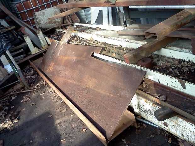 Con la ayuda de mi compañero de tienda, nos precariamente apretamientos, estiramientos, este 1/2" acero placa gruesa hacia fuera debajo de nuestro estante del material. Placa de acero es de 20 lb/sq pies a. 5" de espesor. Esta placa fue de 2,5 x 9'. Hacer la matemática.