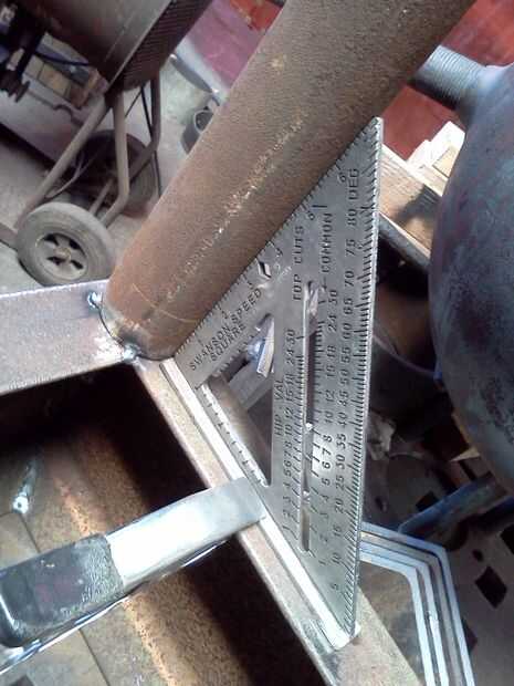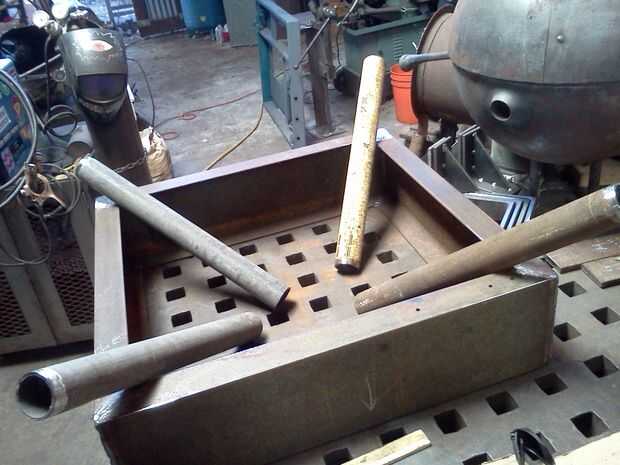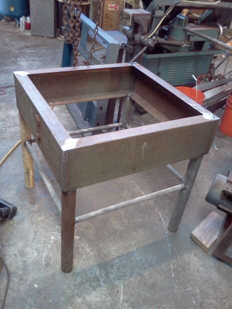 Una vez cortadas y tierra reuní los canales en un cuadrado y tachuela soldando. También corté cuatro longitudes de 23" de un 3" schedule 40 pipe. Éstos se convirtieron en las piernas, que luego coloqué en el marco cuadrado y tachuela soldada con autógena en la posición.