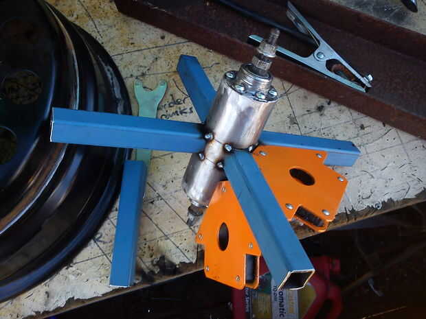 Si usted está planeando en radios de una llanta de coche y su eje de la soldadura, usted encontrará que el tubo central no es lo suficientemente fuerte en su propio apoyo, necesita apoyo del tubo y también conectar las dos tapas para detenerlos viene libre del eje, una solución para hacer esto es encontrar un buen trozo de tubo de esgrima del tamaño correcto se deslice sobre su eje de toda , cortar a la longitud correcta para satisfacer ambos extremos y soldar a las tapas, terminarás con algo como esto...