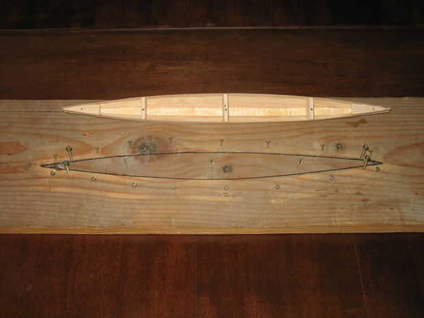 Dibujar en un tablero el contorno de la línea de flotación. En el medio, ¼ largo y unos centímetros de los extremos puede poner en la línea central un clavo (sólo las palmadas). Alrededor de ellos simétricos a ambos lados puedes poner oblicuamente tornillos (45 grados). Ponemos los RIP centro aburrido en las uñas. Que poner en ellos los marcos longitudinales y atarlos a los tornillos de ambos lados con cortarla. Pegamos el marco con el pegamento de epoxyde rápido de un componente. Endurece en aproximadamente 2 horas (incluso el pegamento 5 minutos), ya en algunos lugares hay es más adhesivo, con presión de luz se puede ver si está aún líquido. Cuando se es estafado, puede pulir a la verdadera forma, principalmente en las extremidades y lateral en el 120 grado corte longitudinales Marcos, porque thay tiene que dar lateral una superficie cilíndrica continua para traslapar las tablas.