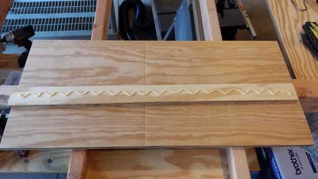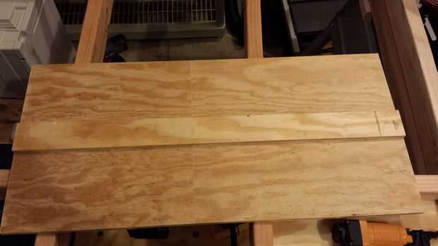 La izquierda sobre madera contrachapada de 1/2" de este proyecto se utiliza para reforzar las estanterías existentes - doble el espesor en los bordes. La tira de hoja de 4 x 8 de corte es aproximadamente 2.5" ancho y 8' de largo, y que producirá (3) secciones en 31,5". (8) de estas piezas se utilizará para los estantes centrales, como la parte superior no es necesario el refuerzo y los estantes de la parte inferior se verá reforzados diferentemente, cubriremos durante la instalación.