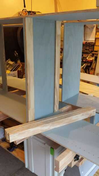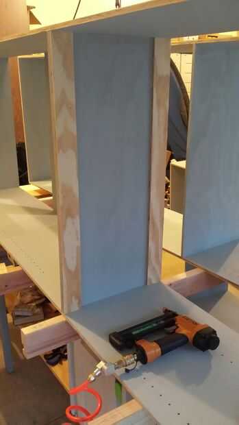 Todos los estantes extraíbles se cortan 1,5 mm más corta (aproximadamente 1/16") por lo que es más fácil moverlos hacia arriba y hacia abajo, y también se reforzará con una o dos tiras de madera contrachapada. Pintura será opcional.