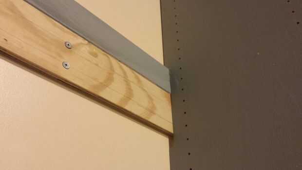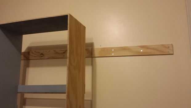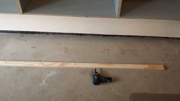 Último paso es apoyar y asegurar la pared de los gabinetes con dos tiras de 2" de ancho de madera contrachapada en la parte inferior. Directamente debajo de los gabinetes atornillados a la pared y la otra llave el frente de los estantes de la parte inferior. Puesto que el gabinete haya cerrado puertas, se adjuntará el tirante inferior desde el lado de la estantería con tornillos del disipador del contador. Después de comprobar los gabinetes de plomo a la línea de nivel y cuadrado a otro, unidad s unos tornillos a través de los estantes de abajo a la tira de madera soporte inferior para bloquear todo juntos.