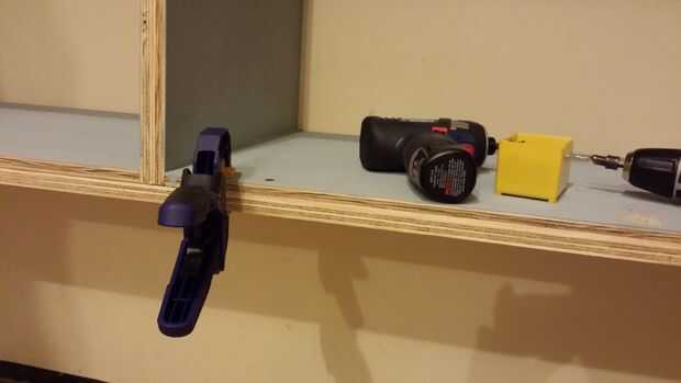 Utilice las abrazaderas firmemente dos de los laterales de los gabinetes juntos y atornille con tornillos de 1" en diferentes puntos a lo largo de los paneles, asegúrese de tenerlos Plaza marcando diagonalmente el panel con nivel y medición de la Asamblea. Este paso es muy importante ya que tendrá un gran impacto en la guarnición de la puerta.