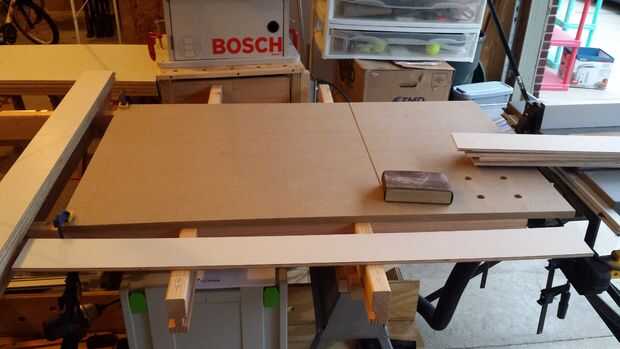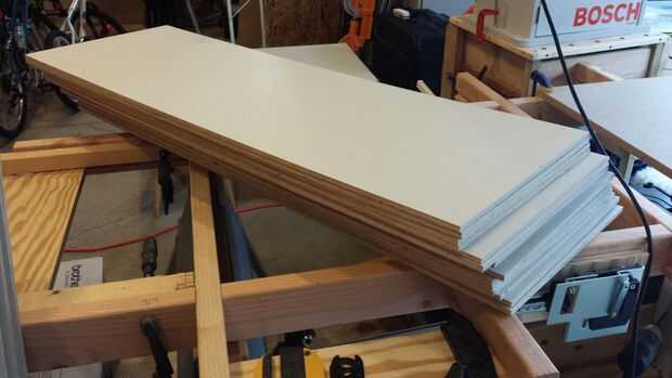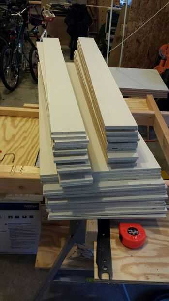 Se descomponen cada uno de (4) hojas de madera contrachapada de 3/8" 4 x 8 a 4 48" x 24" hojas (16 total) y corte una puerta de 48" x 16 1/8" de cada hoja (todos a la vez mientras los sistemas de Sierra de la tabla para arriba), cerca de Sierra de mesa a 3 3/4" de ajustar y cortar dos tiras más de cada material restante , esta algo máximo hacia fuera el uso de la hoja completa (tendrá unas tiras izquierda tal vez para cajones más adelante?), podría rendir más si rip el completo 8' largo madera contrachapada, pero algo se encargaría de la pieza más pequeña cuando se utiliza la tabla VI, se siente más seguro.
